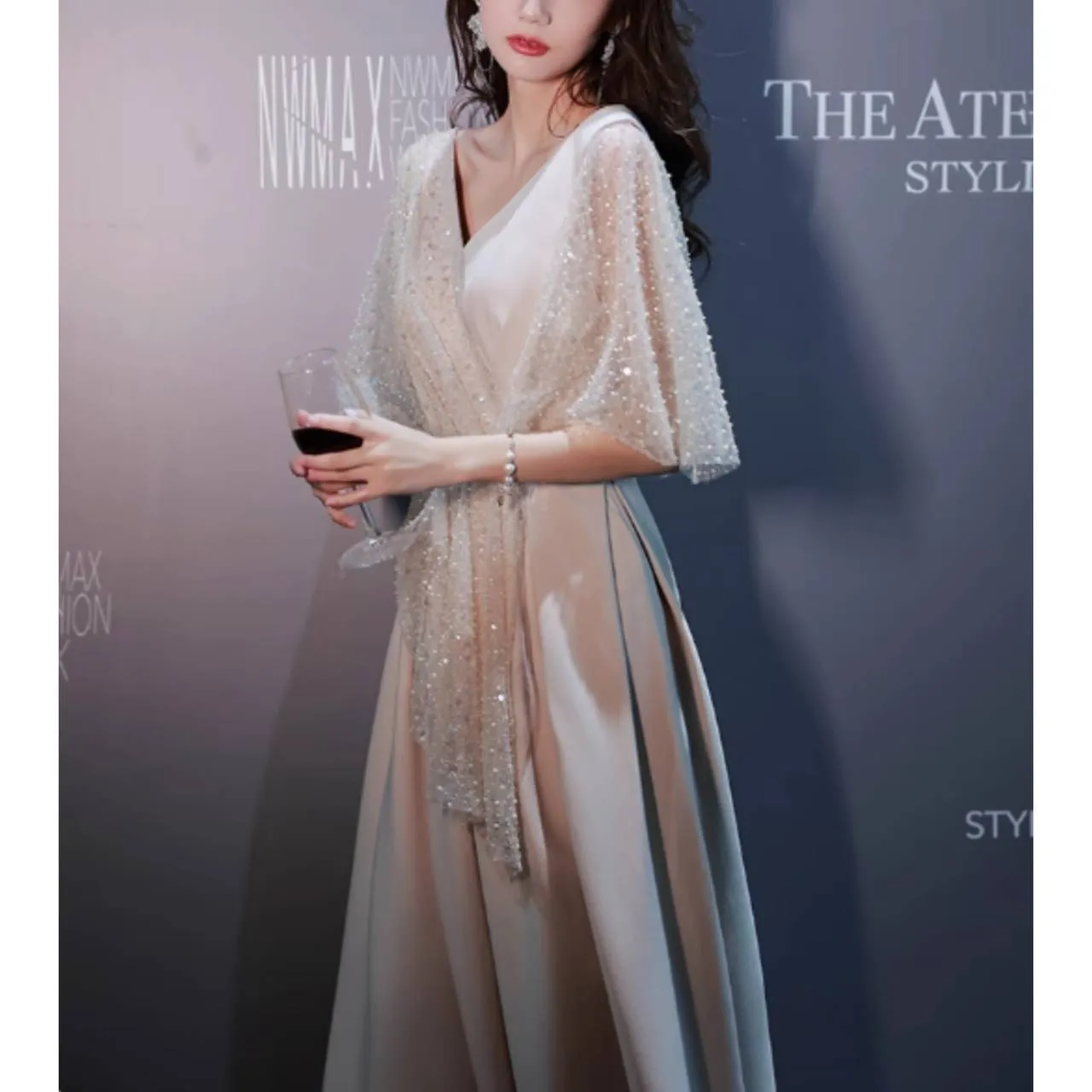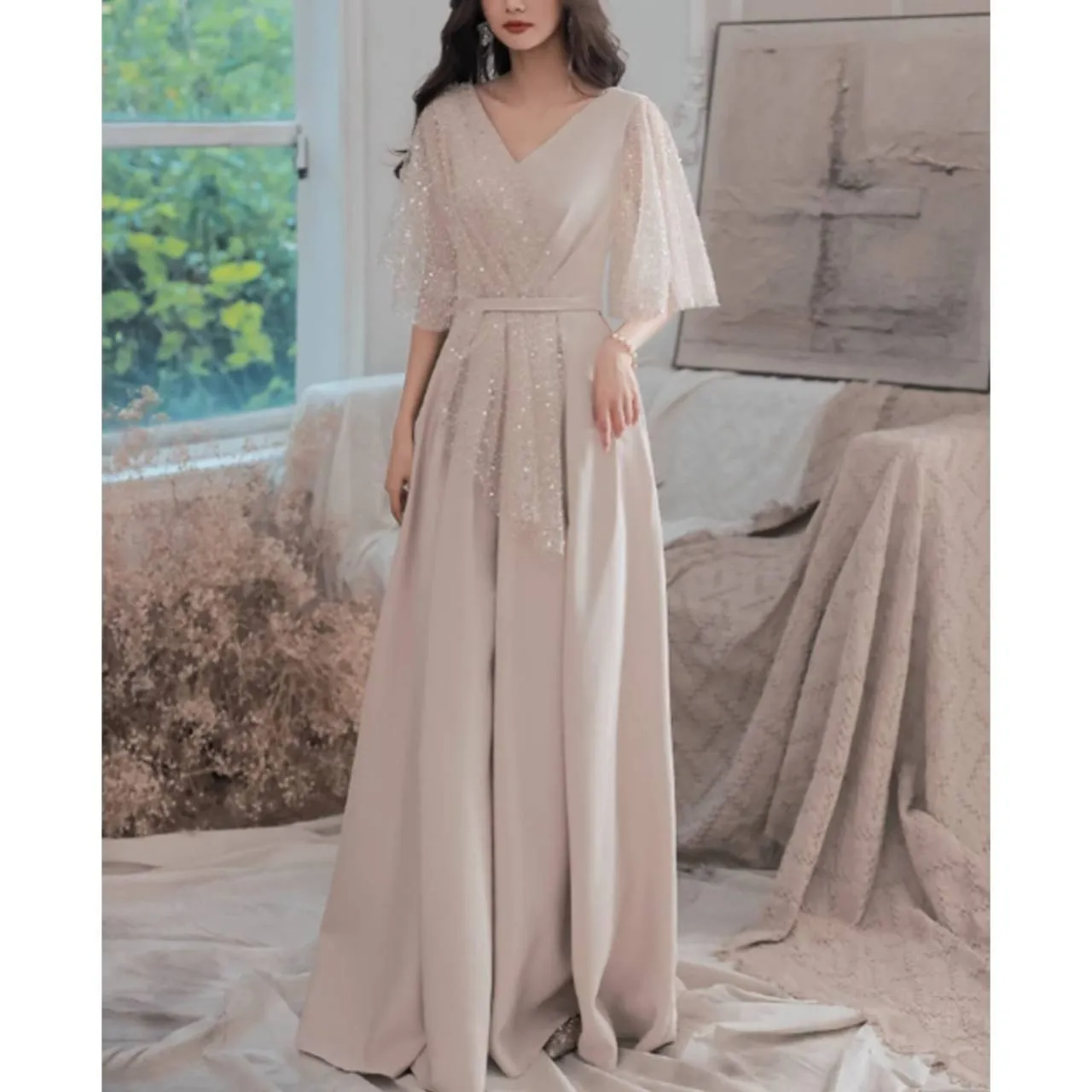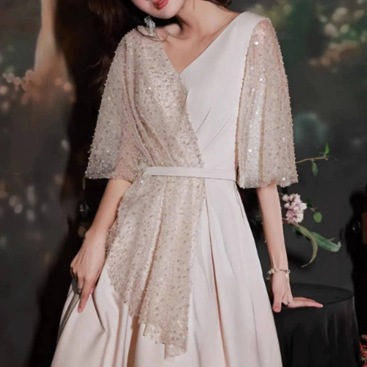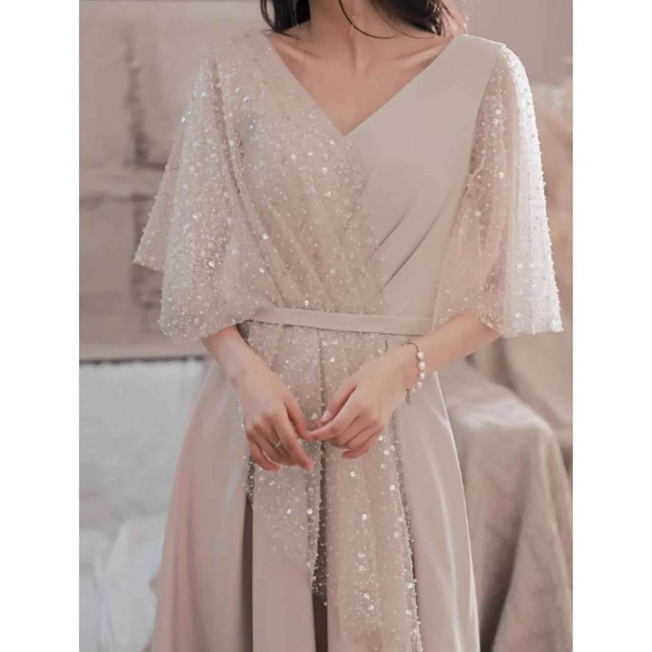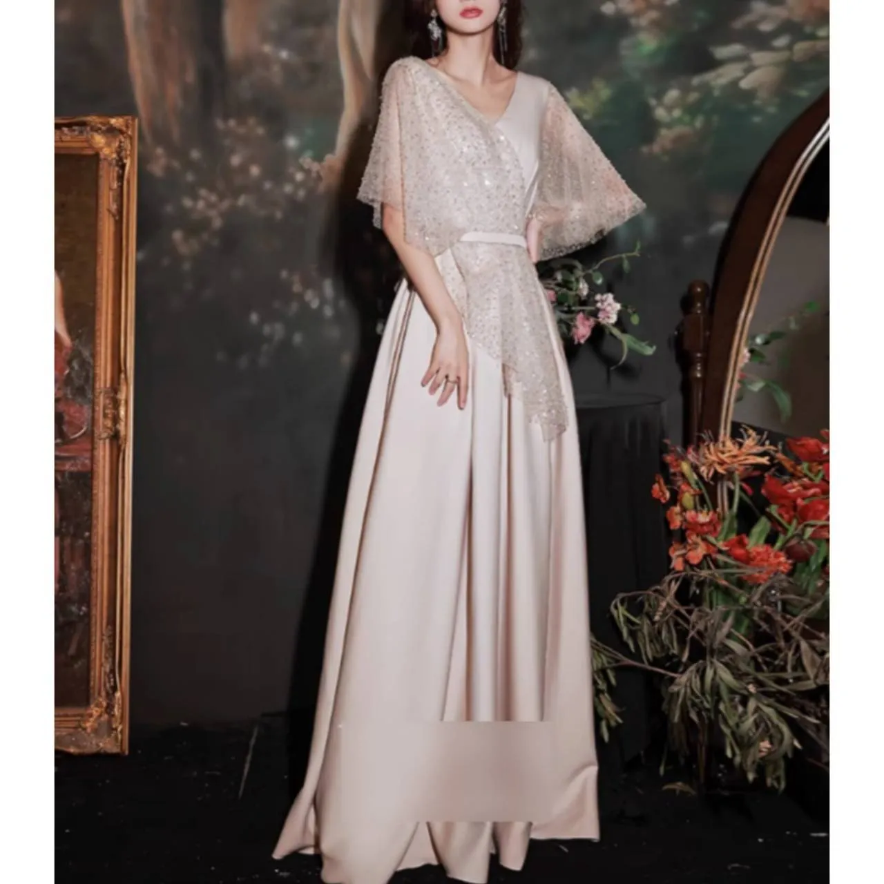5分袖 フレアスリーブ ドレス イブニングドレス シアー キラキラ スパンコール Aライン ロング 韓国【B6217】