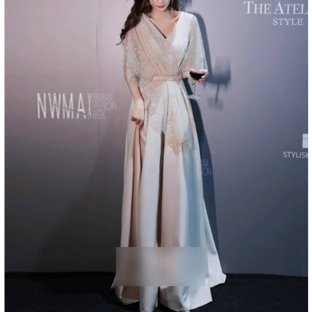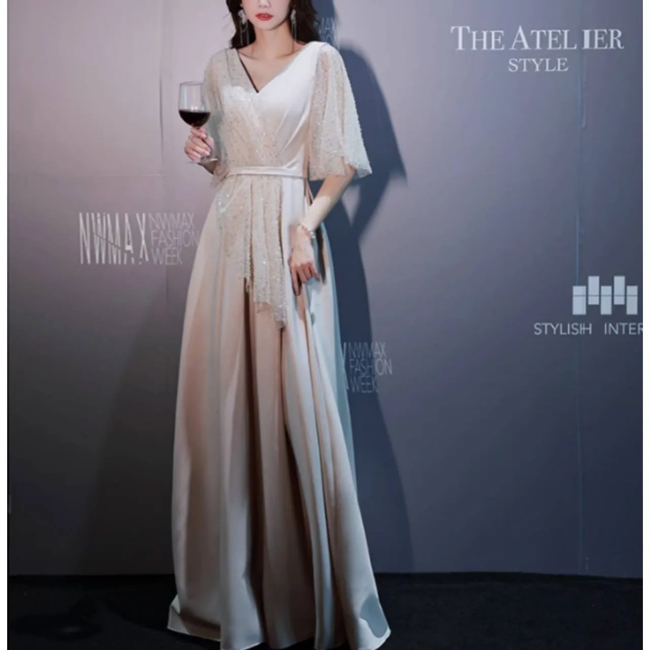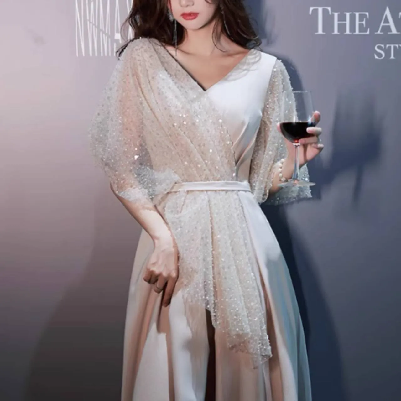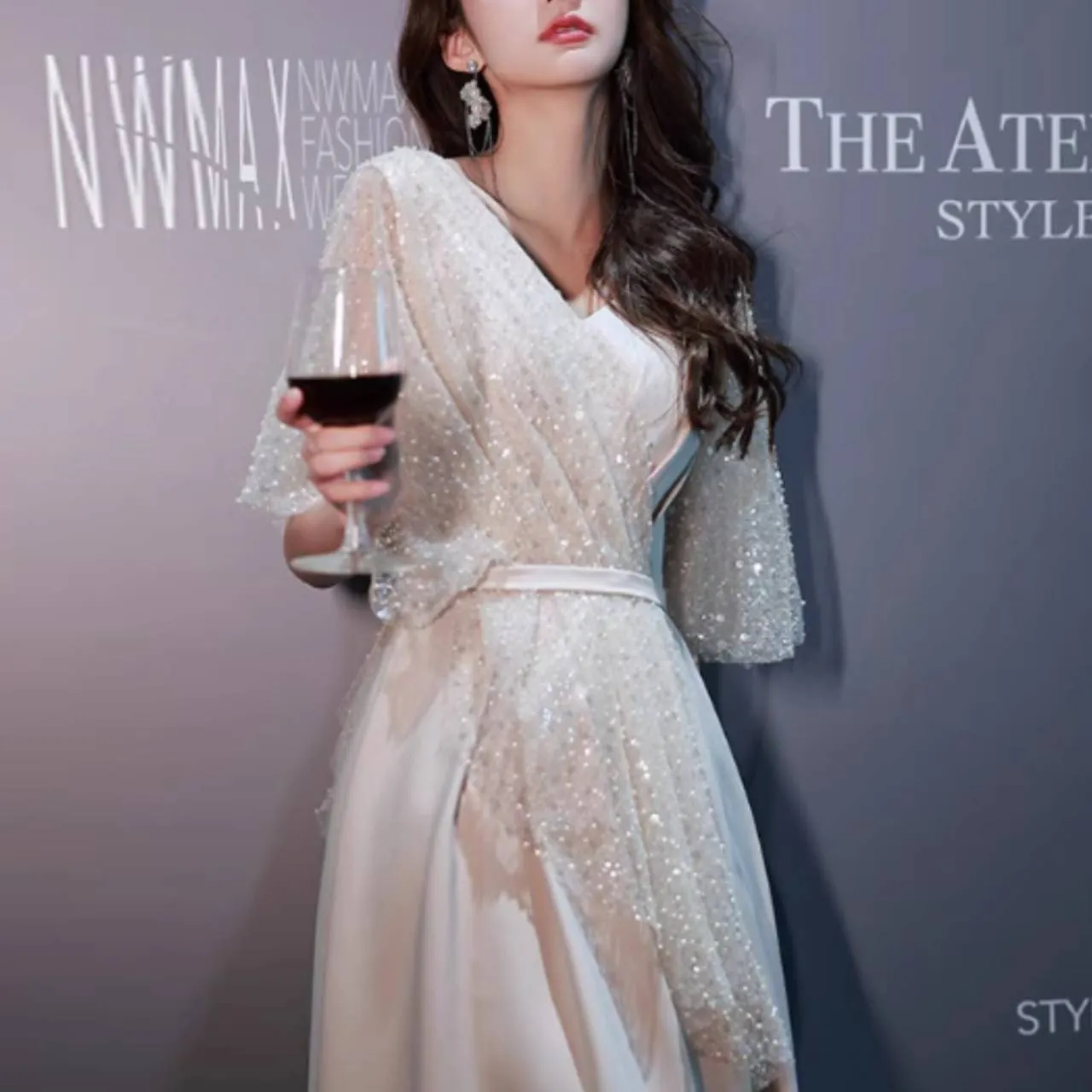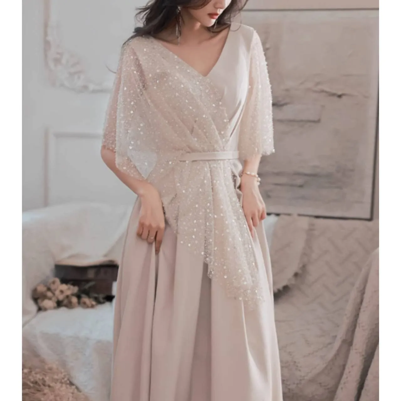5分袖 フレアスリーブ ドレス イブニングドレス シアー キラキラ スパンコール Aライン ロング 韓国【B6217】