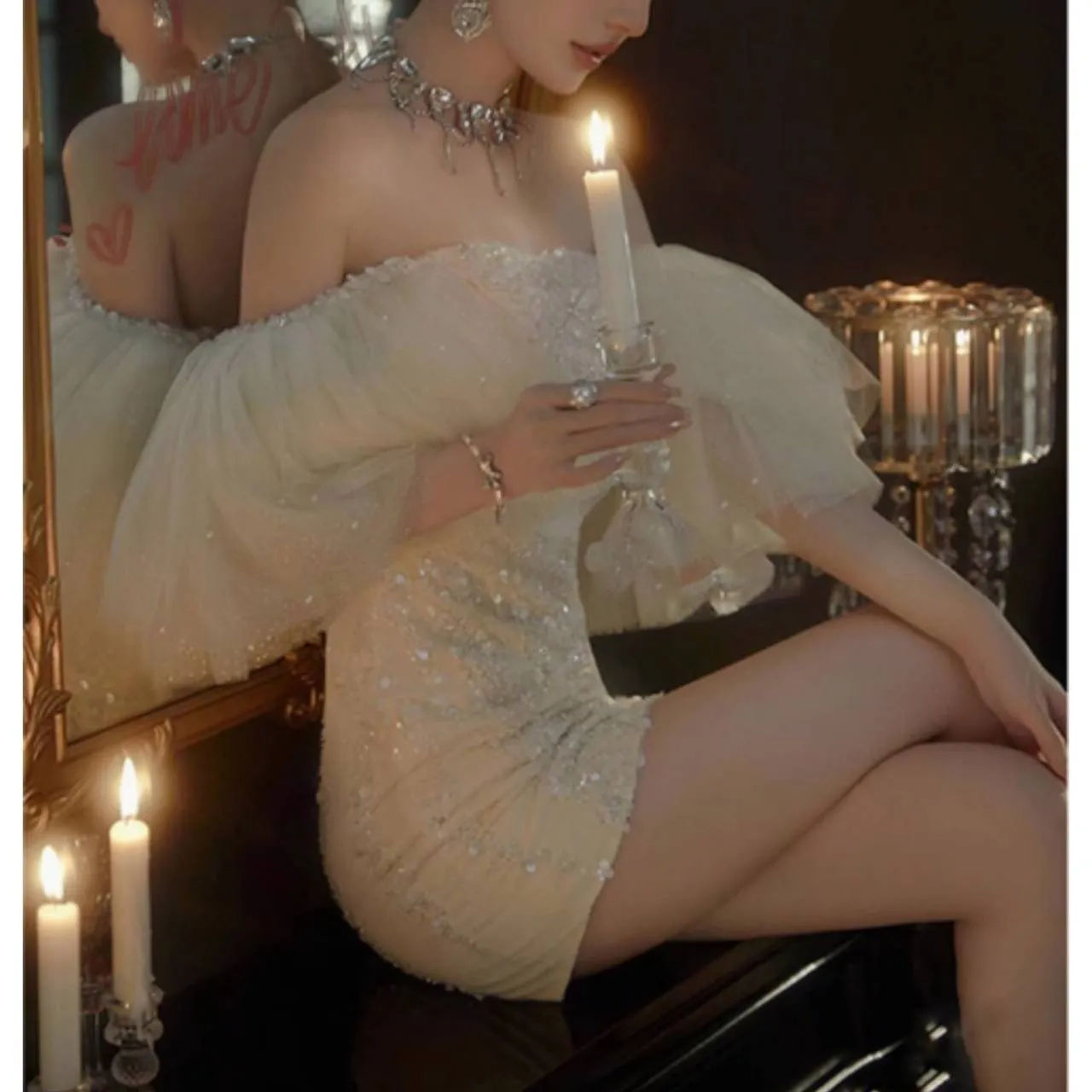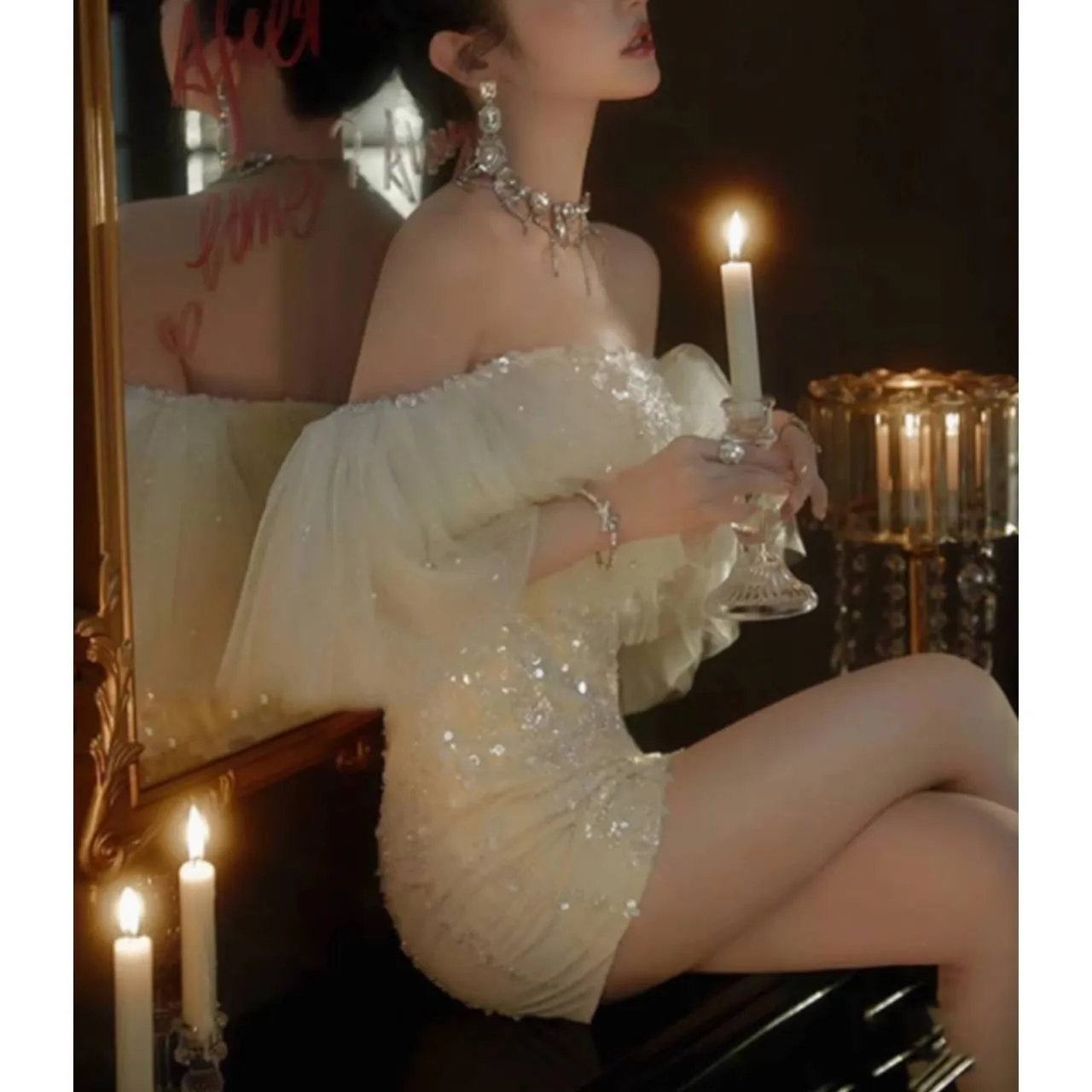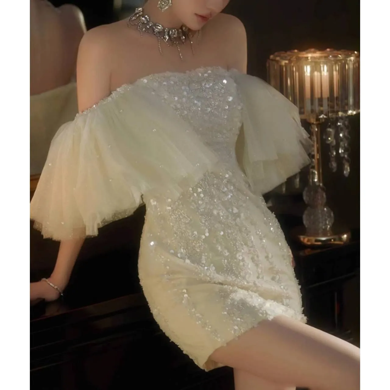オフショルダー ウェディングドレス ミニ丈 キラキラ ビジュー シアースリーブ ボリューム袖 タイト バックリボン 韓国【K12774】